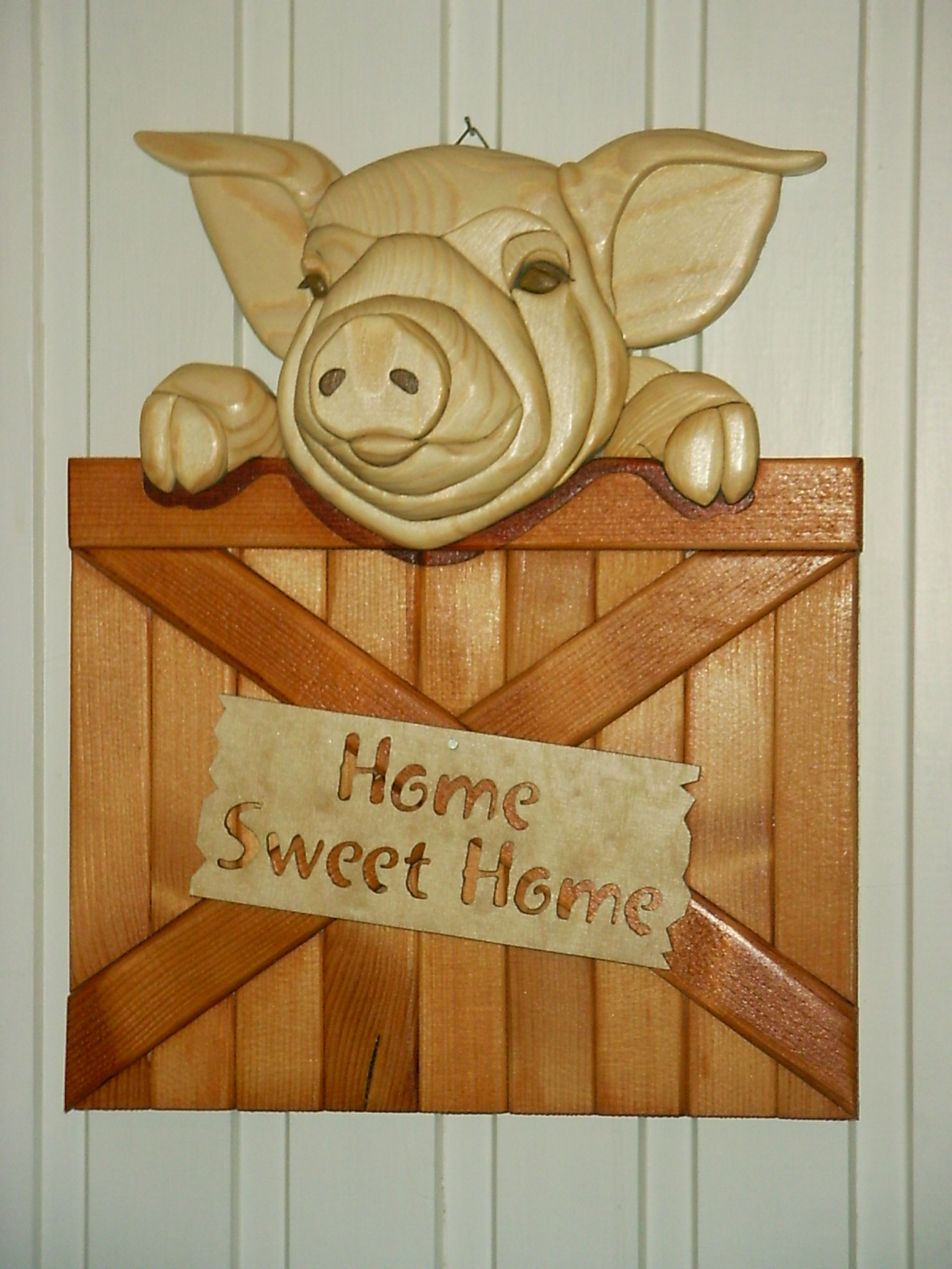 This is my first attempt on making intarsia (made some time ago). The pattern is made by Judy Gale Roberts and Jerry Booher and was published in Scrollsaw Woodworking & Crafts, Issue 8. Most of the picture is made from pine (the eyes and nostrils are made from a piece of scrap hardwood I had in the shop – Itaube, I believe). I stained the pine in two different shades of cherry and finished with a clear lacquer on top. Even if everything is made from pine, I still made every piece separately to place the grain as suggested in the plans.